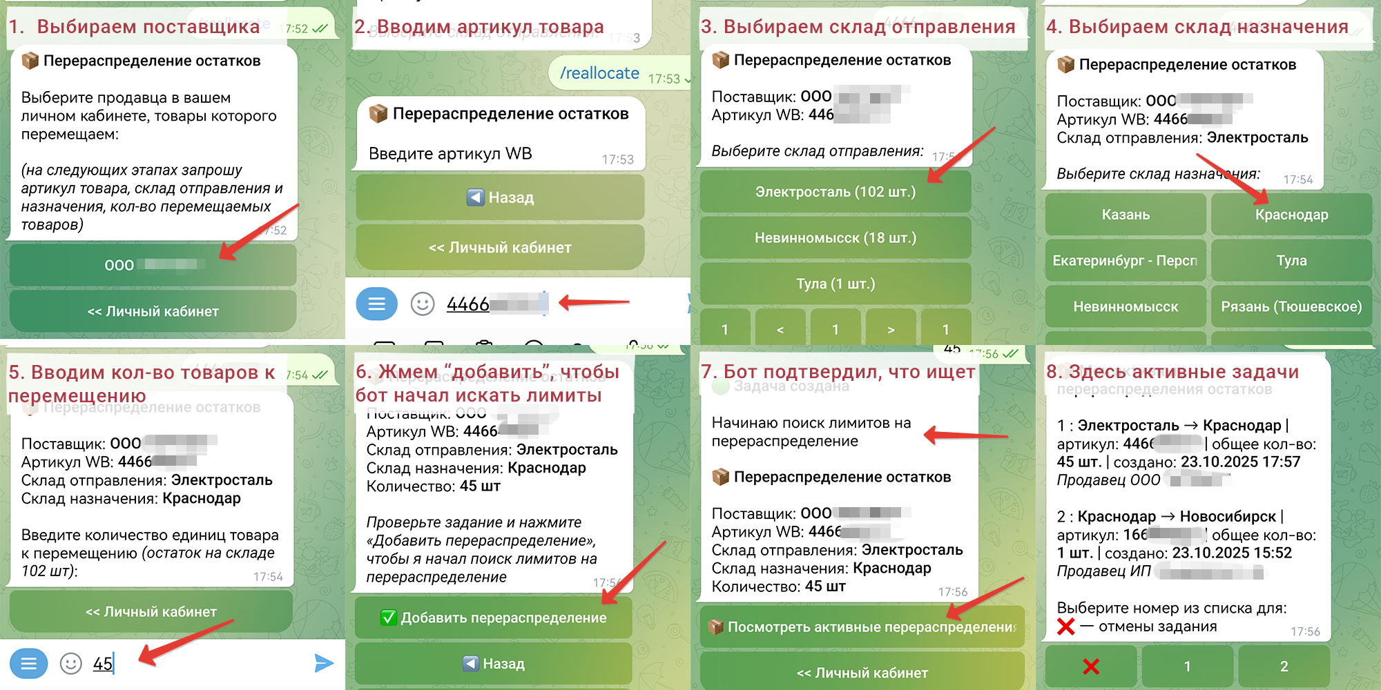 Ниже представлен алгоритм создания задания на бронирование лимита для перераспределения товаров между складами Wildberries через наш бот:
